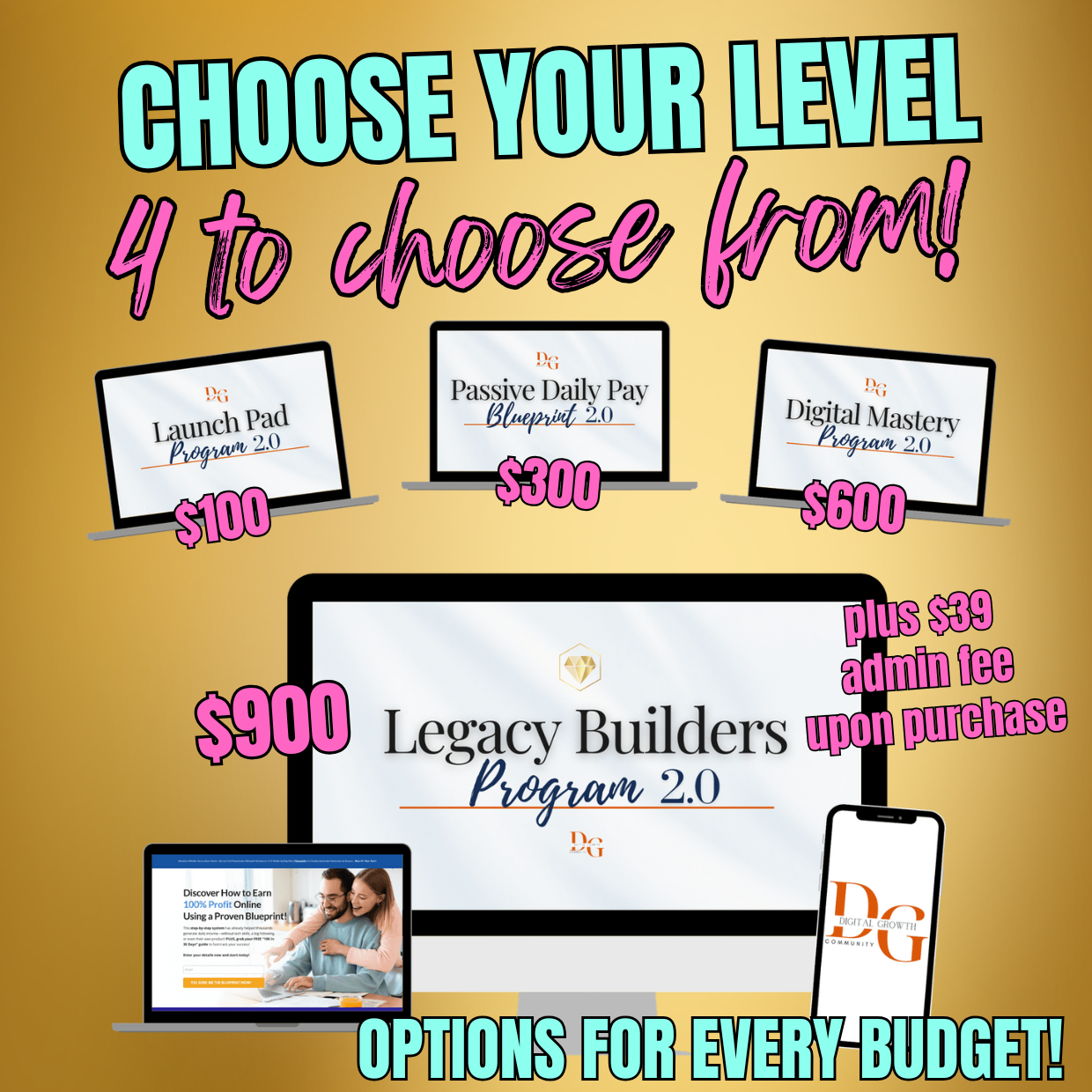 You can choose which level is right for YOU. The $100, $300, $600 or $900 levels provide great options for every budget. Don't forget you will also pay the one-time $39 admin fee after your purchase your level. This will get you access to your online course, hands-on community, and a done-for-you systeme io funnel to get up and running quickly!